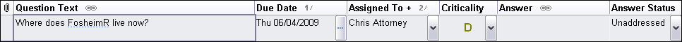 The Questions spreadsheet is used to track both questions about the case or upcoming depositions, as well as to enter and assign task items for staff to complete. To evaluate case progress and ensure you are meeting targeted deadlines, mark questions or tasks with a Criticality status and run searches to instantly review outstanding items. If you have a question about a document, you can attach that source file to the question record and assign it to a case user to research. You can also enter questions for witnesses and link the record to people in the Questions For field so you can print a report for an upcoming deposition.