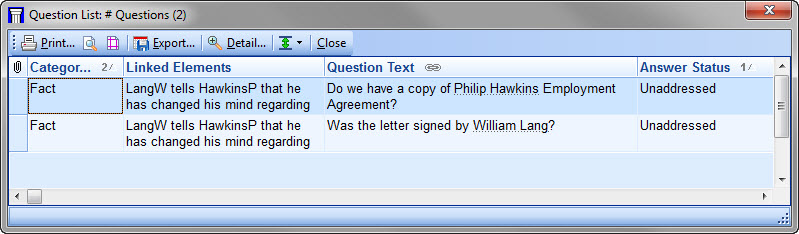 If you are linking question records to other spreadsheet records frequently, you may want to add the Question button to the standard CaseMap toolbar for easy access. For example, clicking the Add Question button from the Facts spreadsheets displays the Questions Detail dialog box where you can type in a new question record without having to leave the Facts spreadsheet. If you also insert the # Questions field into the Facts spreadsheet then the number of linked questions displays for that record. In the # Questions cell, click the Ellipsis button to display a list box with all linked questions for that record. You can also print the question list as a hard copy or save it as a PDF.