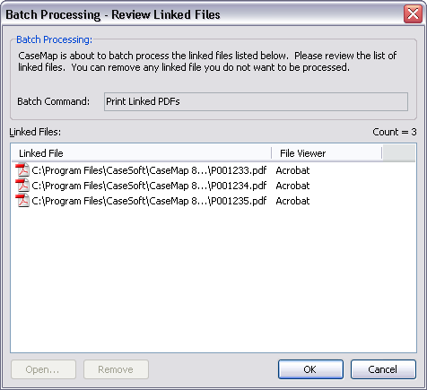 The Batch Print PDFs tool allows you to print a set of PDFs in a spreadsheet that were linked using the Send to CaseMap utility in CaseMap. Documents that were manually linked to records in a spreadsheet will not be included. Only PDF files linked to case records in the current spreadsheet view will be printed. The Batch Print PDFs feature is located on the Tools menu by clicking Linked Files > Batch Processing > Print Linked PDFs.