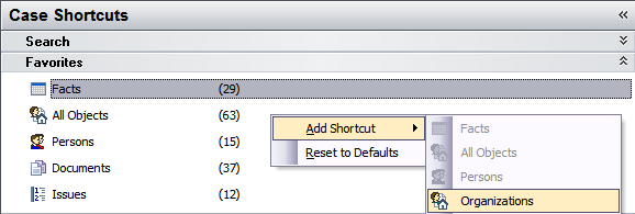 The Favorites pane includes default shortcuts to the following spreadsheets: Facts, All Objects, Persons, Documents, and Issues. You can modify the icons that display in this task pane for those you use most often. And you can rearrange them by preference.