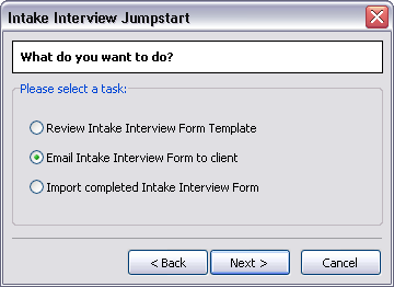 | 3. | In the What do you want to do? box, select Email Intake Interview Form to clients, then click Next. |