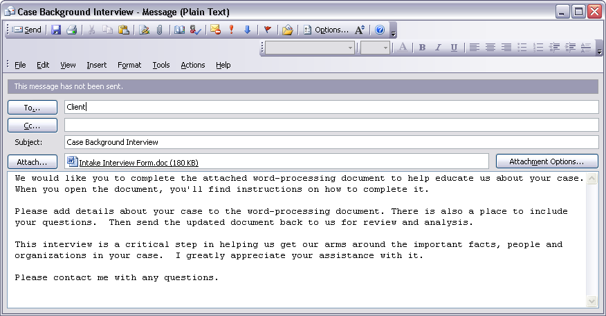 After you've customized the Intake Interview form, you can simply email it to clients to complete and then email it back to you. A CaseMap wizard is used to insert the template into a Microsoft® Outlook email, which includes that attachment with default email content that you can use or customize.