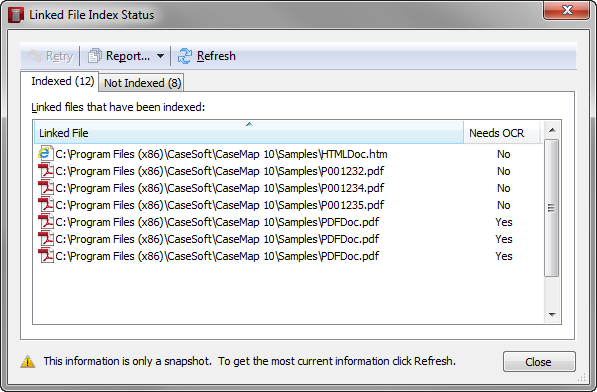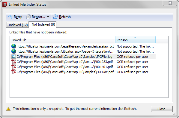 The Linked File Index Status dialog box allows you to track your case index status for files that were successfully indexed and those that were not indexed.