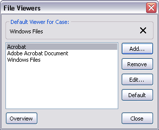 The default file viewer in CaseMap is Microsoft® Word. To find out if you have additional file viewers set up in CaseMap, click on the Tools menu and click Linked Files, and then click Manage File Viewers on the submenu. The File Viewers dialog box displays a listing of all programs that have been added to your licensed copy of CaseMap. Here you can add, remove, and edit file viewers, as well as change the default viewer being used. Other users who want to view the same native source files need to ensure they have added the applications to the File Viewers dialog box too.