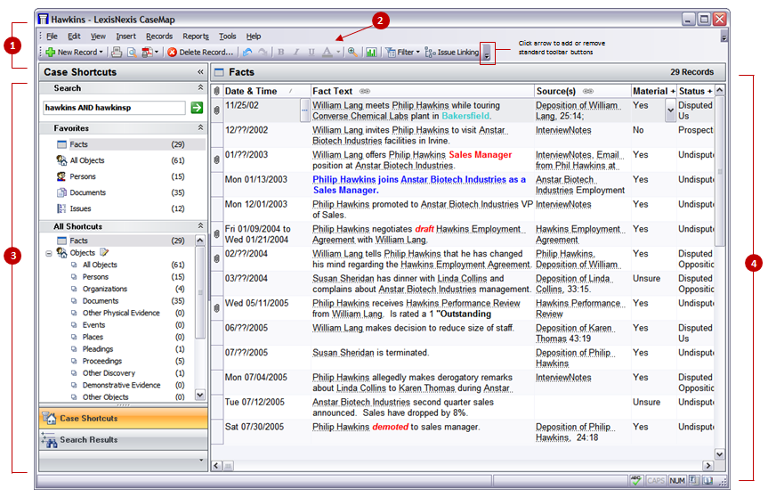 CaseMap's user interface is designed so your spreadsheet data displays in the primary workspace pane for maximum viewing. This workspace pane is where you will enter and track facts, objects, documents, and issues in individual spreadsheets. To move quickly between each spreadsheet, you will use the Navigation pane on the left side of the application. The Navigation pane has two interchangeable panes: Case Shortcuts and Search Results. Each pane is then divided into task panes where tools or shortcuts are organized by groups.