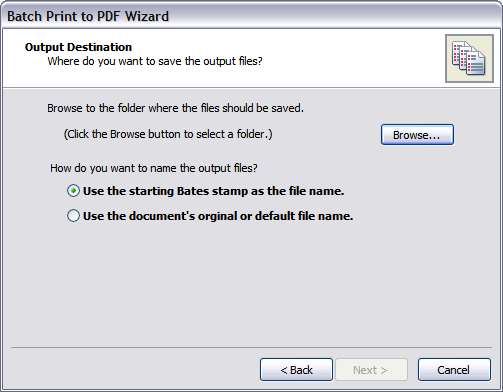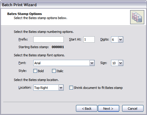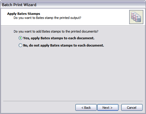 | 9. | In the Apply Bates Stamp dialog box, select whether you want to apply Bates stamps to the printed documents, then click Next. |