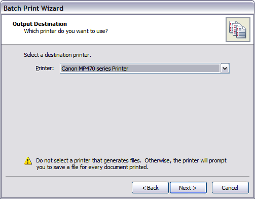 Do not select a printer that generates files. Otherwise, the printer will prompt you to save a file for every document printed.