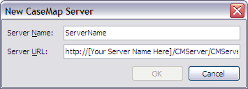 | 4. | In the New CaseMap Server dialog box, type in the client server address in the Server Name field. |