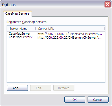 | 2. | In the Options dialog box, click the CaseMap Servers tab. |