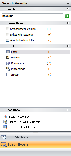 When you are finished viewing your search results, click on the Case Shortcuts button to return to the spreadsheet you were last using. If you click on the Search Results button again, you will see results for the last search query run. For information about printing search results in reports, see Printing search reports. |