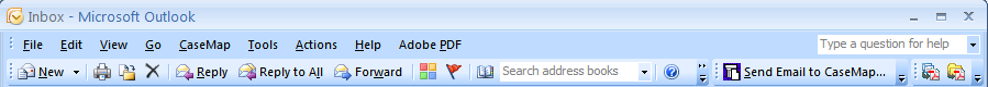 You can send emails from Microsoft® Outlook 2007 and 2010 to a CaseMap v10+ case. In Outlook, the Send Email to CaseMap features display on a CaseMap menu, as a toolbar button, and as a CaseMap ribbon in Outlook 2007, and on a CaseMap ribbon in Outlook 2010. The Outlook plug-in is optional during CaseMap installation.