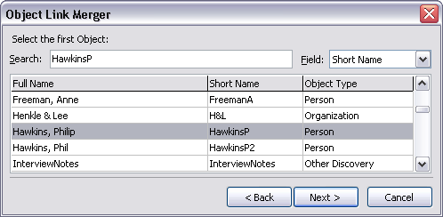 If two objects with similar short names are entered into the case and are actually the same object, you need to merge them together to reduce linking and sorting consistencies in the case. Using the Object Link Merger tool, you select one object to keep and one to delete, and the utility transfers the links for you.