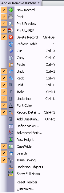 Click on the down arrow at the far right of the toolbar to view a listing of the buttons available. Button selections change depending on what spreadsheet is active when you view the toolbar button listing. Simply select the buttons to add/remove buttons that you use most often. All checked buttons display on the Standard toolbar. To reset the toolbar to its original default view (as shown below), click on the down arrow to view the toolbar menu and select Reset Toolbar.
