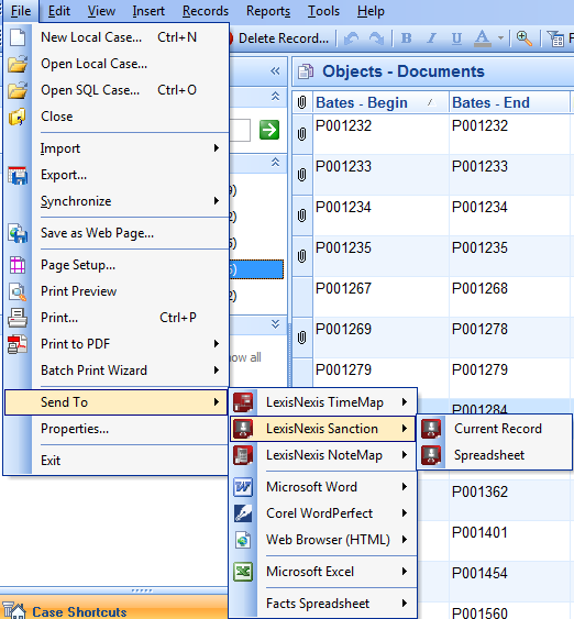 | 5. | On the LexisNexis Sanction submenu, click Current Record to send the selected record to the Exhibits subfolder in Sanction called, From CaseMap. |