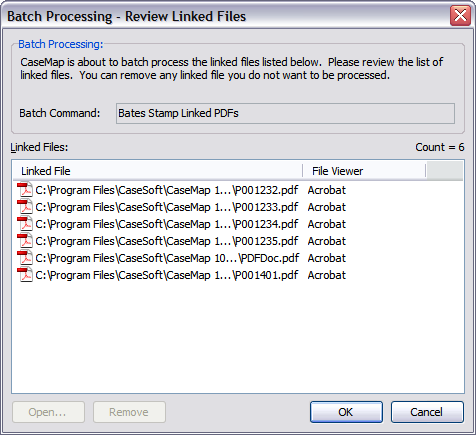 | 3. | In the Batch Processing - Review Linked Files dialog box, review linked files and remove any you do not want to Bates stamp. |