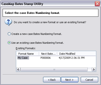 If you select the Use an existing case Bates Numbering format option, CaseMap will continue using the format you have already been using.
