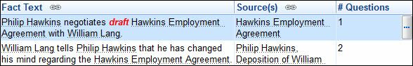 If you are linking question records to other spreadsheet records frequently, you may want to add the Question button to the CaseMap Quick Access Toolbar for easy access. For example, clicking the Add Question button from the Facts spreadsheets displays the Questions Detail dialog box where you can type in a new question record without having to leave the Facts spreadsheet. If you also insert the # Questions field into the Facts spreadsheet then the number of linked questions displays for that record. In the # Questions cell, click the Ellipsis button to display a list box with all linked questions for that record. You can also print the question list as a hard copy or save it as a PDF.