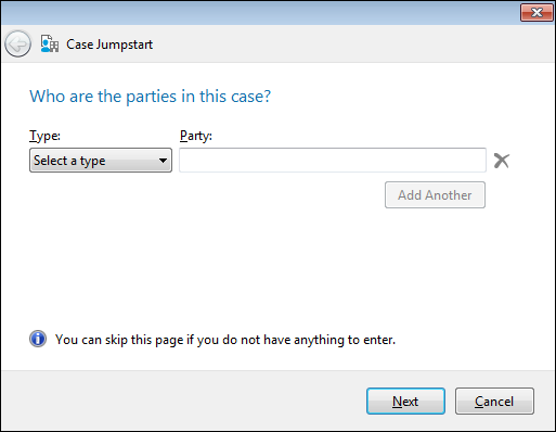 The Case Jumpstart Wizard helps you get started building the cast of characters and entering information when you create a new case. The wizard also helps you categorize the different types of people and organizations involved in the case. Each page is optional and can be skipped if you do not have any entries. As you work with the wizard, check marks display next to the categories that contain information. When you have completed the data entry, the information populates the All Objects spreadsheet as well as the sub-level object spreadsheets.