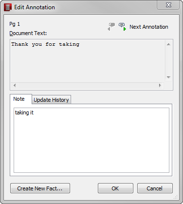 The Edit Annotation dialog box displays update history if more than one edit has occurred for an annotation or more than one note has been applied to the same highlighted text. The Update History tab displays the user's short name who created the annotation, the date and time it was created, the last user who updated it, and the date and time it was last updated.