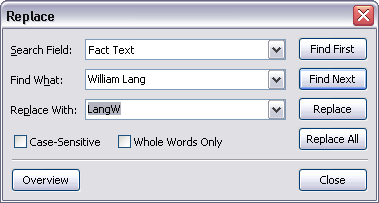 When searching for data using the Find feature, you are limited to searching one field at a time. If you need to replace data, you can only do so in fields listed in the Search Field listing. You cannot replace data in the following fields: read-only, fixed lists, open-ended lists, evaluation fields, and check boxes.