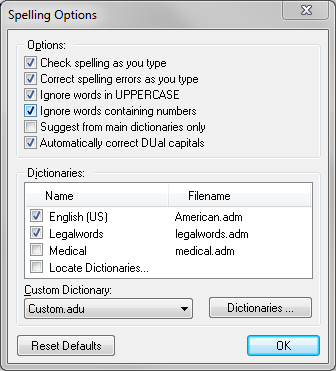 | 6. | Optional: Click the Reset Defaults button to reactivate spelling default settings. |