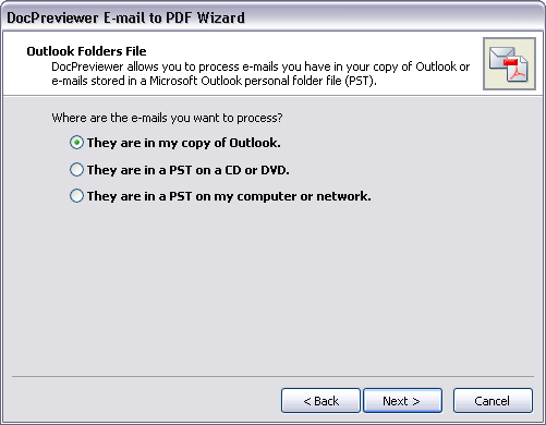 The Emails to PDF wizard is part of the DocPreviewer premium feature set, which requires and additional subscription. The Emails to PDF wizard allows you to convert Microsoft® Outlook emails in one or more folders to Adobe® Acrobat PDF files. The conversion utility guides you to choose an Outlook folder(s) to convert to PDF files, select a network folder in which to store the saved PDF files, and then import the emails into CaseMap.