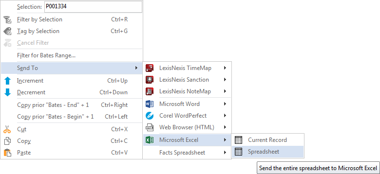 From the Objects - Documents list, you can also right-click on the record being sent to Microsoft Excel, and then click the Send To > Microsoft Excel > Spreadsheet.