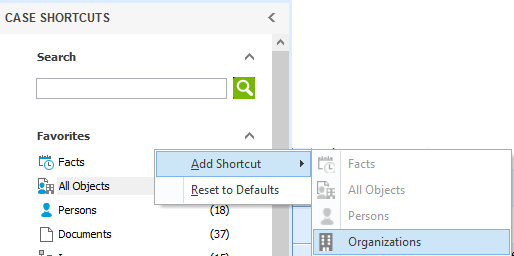 The Favorites pane includes default shortcuts to the following spreadsheets: Facts, All Objects, Persons, Documents, and Issues. You can modify the icons that display in this task pane for those you use most often. And you can rearrange them by preference.