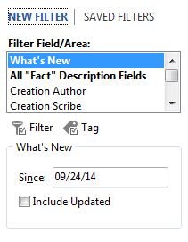 In the New Filter pane, you will also find two additional filter selections that are bolded in the Filter Field/Area drop-down listing. What's New provides the ability for precise record updates filters that are limited to a day/week/month/three month timeframe. The All "Fact" Description Fields option limits the filter to only description fields in the Facts spreadsheet.