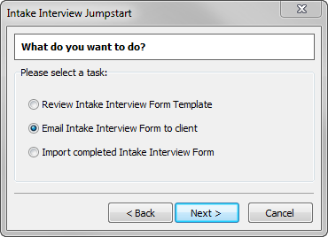 | 4. | In the What do you want to do? box, select Email Intake Interview Form to client, then click Next. |