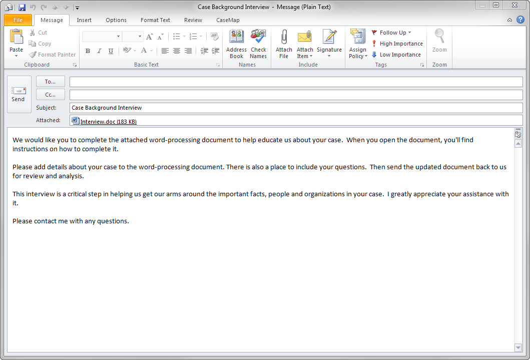 After you've customized the Intake Interview form, you can simply email it to clients to complete and then email it back to you. A CaseMap wizard is used to insert the template into a Microsoft® Outlook email, which includes that attachment with default email content that you can use or customize.