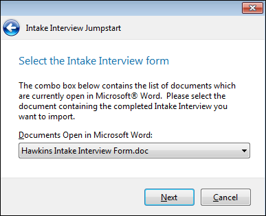 Once the Intake Interview Form is completed by you or the client, importing the content back into the case is easily following the steps in the Intake Interview Jumpstart Wizard.