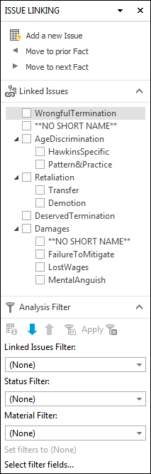 The Issue Linking pane is used to quickly link facts, objects, questions, and research authorities to issues.