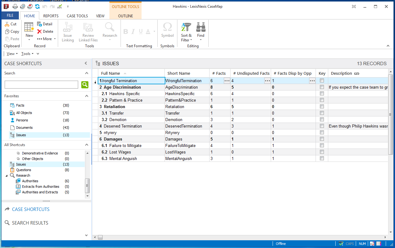 Issue outlining most often begins when you first accept a client case and becomes an unending work-in-progress throughout the life of a case. When you accept a case, start outlining your issues in the Issues spreadsheet so you can quickly develop a hierarchy of claims, counterclaims, and any other known arguments.
