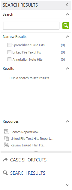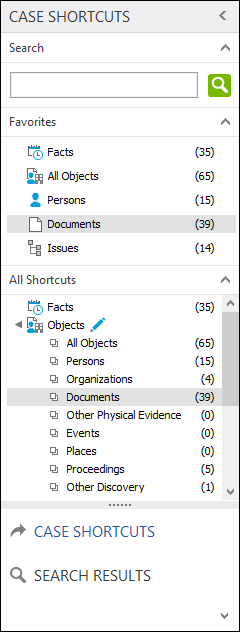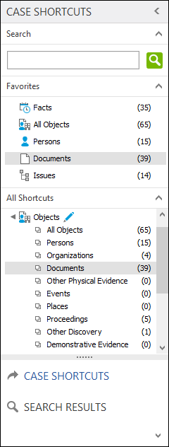 The Navigation pane runs vertically along the left side of CaseMap and provides access to two different panes: Case Shortcuts and Search Results. Click on the Navigation buttons at the bottom of the pane to access each set of tools.