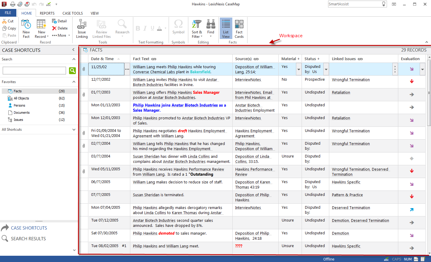 Displays the various spreadsheets you will work in for your case, including the Facts, Persons, Documents, Issues, Events, Pleadings, Proceedings, Questions, and Research spreadsheets, among others. These spreadsheets are where you will enter, modify, and track your case data. Spreadsheet entries are called objects and are collectively displayed in the All Objects spreadsheet. |