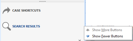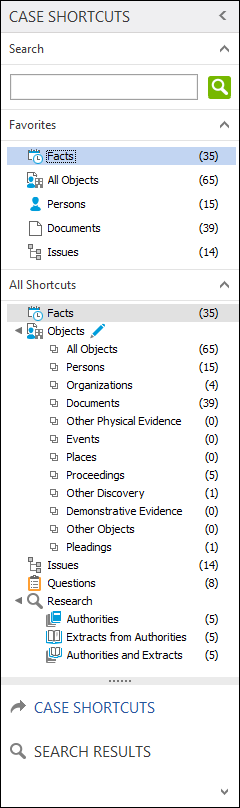The Navigation pane is a vertical bar located on the left side of your screen when you open a case in CaseMap. CaseMap's Navigation pane has two task panes: Case Shortcuts and Search Results. The default setup is to display the Case Shortcuts pane, which allows you to easily transfer from working in one case spreadsheet to another. The Search Results pane displays after a full-text search is run and provides search results and access to reports.