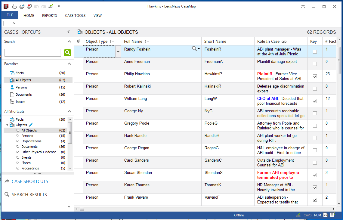 CaseMap's Objects spreadsheets are where you organize your lists of "nouns" or Cast of Characters regarding the case, including persons, places, events, documents, evidence, proceedings, and pleadings. When you read "object" in CaseMap, think of all the people, organizations, documents, and other things that have a role to play in the case.