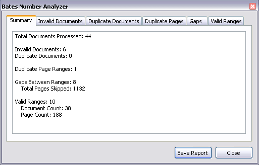 3.In the Bates Number Analyzer dialog box, click on the Summary tab to for a complete summary of document processed.