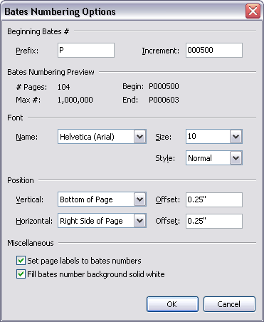 CaseMap Bates Stamp Utility > Bates Numbering dialog box