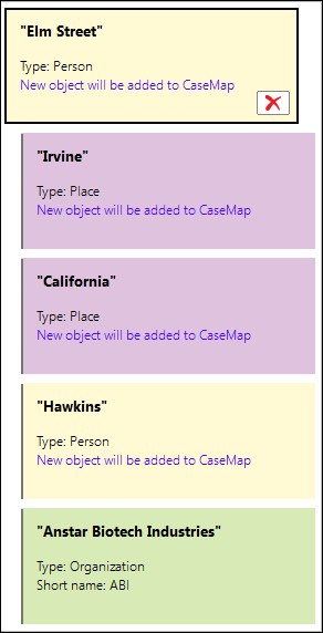 Once Objects recognition is enabled, new and existing objects appear. These are color coded by the object type. (Person, Organization and Place.)