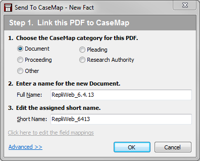 If CaseMap does not recognize the document as on object in the case, a Link this PDF to CaseMap dialog box displays instead for you to add this record to the Documents object spreadsheet. Once you complete this step, you see the Create New Fact dialog box.