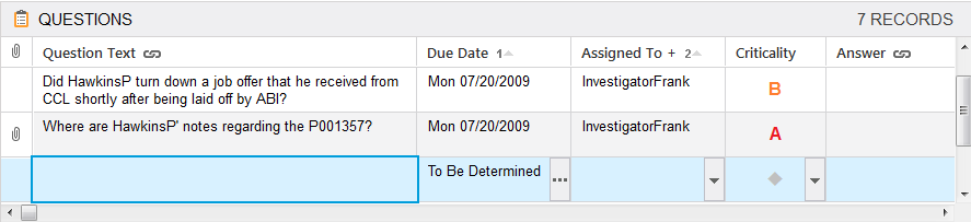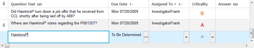 When you first start a case, you want to enter questions that are standard tasks that need to be tracked for each case and/or any generic questions you have that are applicable to specific case types. As the case evolves, you can then add more case specific questions and tasks. You also have the option of entering questions directly from the Facts spreadsheet if something occurs to you while entering or analyzing case information.