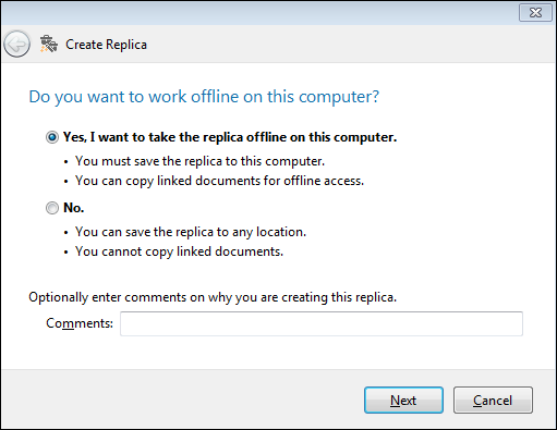 | 4. | In the Do you want to work offline on this computer? dialog box, choose where you want to save the replica. |