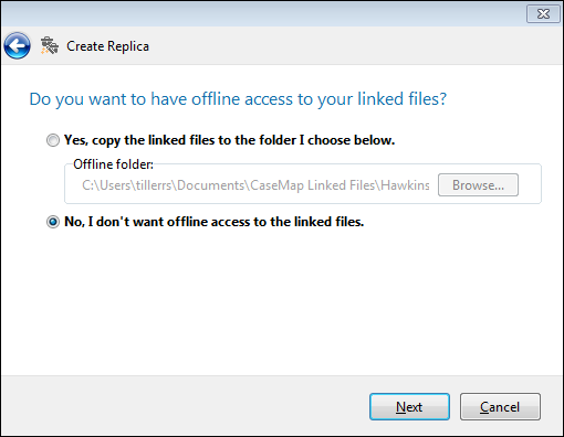 | 6. | In the Do you want to have offline access to your linked files? dialog box, choose whether you want access to linked documents while working in the replica. |