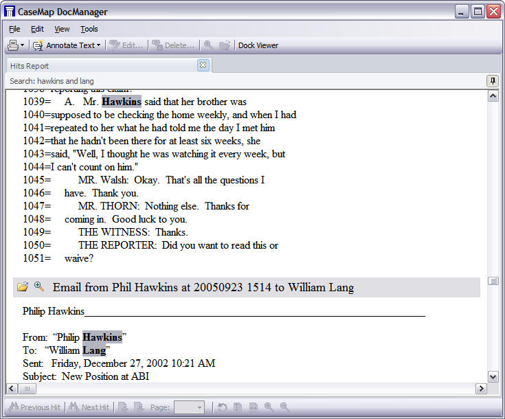 The report now displays in the CaseMap DocManager window with search hits highlighted.