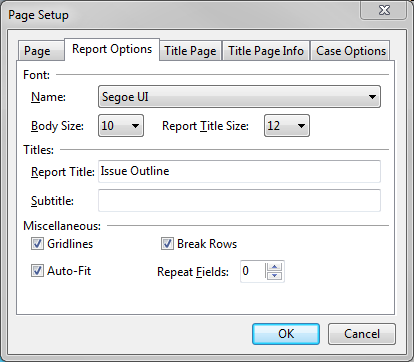 We recommend that you keep the Miscellaneous settings checked for a cleaner report output. If you clear the Gridlines check box, the lines are removed from the printed report. If you clear the Break Rows check box, information from one record row may break and print on the following page. If you clear the Auto-fit check box, information will truncate onto the next page.