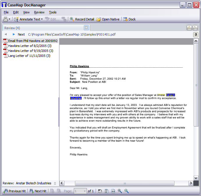 All linked files for the search query now display in the CaseMap DocManager in the Documents pane with the number of search hits to the right of each file name. The first file is automatically opened in DocManager. Notice that your search query displays at the bottom of the Linked Documents pane.