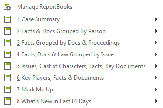 For example, one ReporBook might include an Issue Outline, a Cast of Characters, a Chronology of Key Facts, and a Document Index. A ReportBook can also contain multiple reports based on one CaseMap spreadsheet, such as five reports based on different views of case objects.