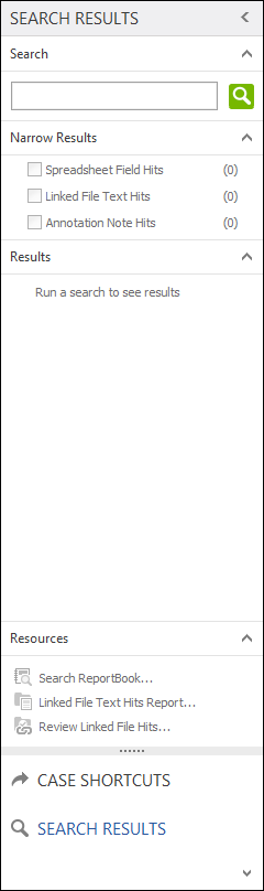 When you are finished viewing your search results, click on the Case Shortcuts button to return to the spreadsheet you were last using. If you click on the Search Results button again, you will see results for the last search query run. For information about printing search results in reports, see Printing search reports. |